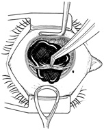 Fig. 20. A foreign body within the anterior chamber may be removed either through an incision directly overlying its position or frequently from a limbal incision across the anterior chamber.