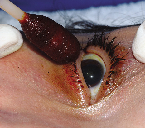 ocular preparation (Fig. 18), using a lid speculum (Fig. 19), and avoiding needle contact with the lid margins and lashes (Fig. 20).