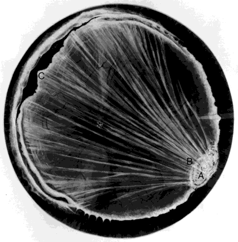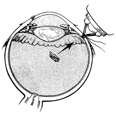 visual acuity of 0.1 from 29% in the 1930s to 67% in 1991.10–12 TERMINOLOGY To avoid confusion, penetration, in this chapter, is defined as a partial cut, tear, or passage through a structure. The term perforation implies complete cutting, tearing, or passage through the referenced structure. Therefore, a corneal laceration is a perforation of the cornea and a penetration of the globe. A foreign body that passes into and out of the eye perforates the globe, but such injures are frequently called double-penetrating, double-perforating, or through-and-through injuries. PATHOGENESIS The etiologies and, therefore, the mechanisms of damage of penetrating injuries are highly variable. They cause a wide spectrum of acute structural alterations and secondary complications that, consequently, call for multiple methods of repair. Acute Effects of Ocular Contusion Penetration of the eye by relatively blunt objects causes compression of the globe with resultant iridoparesis, iridodialysis, subluxation and dislocation of the lens, traumatic cataract, choroidal rupture, and retinal breaks at the vitreous base borders.13,14 Ruptures of the uvea produce anterior chamber, choroidal, subretinal, and vitreous hemorrhage. Massive blunt trauma causes corneal and scleral ruptures and may avulse the optic nerve. Acute Effects of Ocular Penetration Penetrating objects cause lacerations of the cornea, iris, lens, sclera, ciliary body, choroid, retina, and optic nerve. Anterior chamber, choroidal, subretinal, and vitreous hemorrhages result from lacerations of uveal and retinal blood vessels. Perforation of the corneoscleral wall permits prolapse and incarceration of the lens, uvea, retina, and vitreous. Early Secondary Complications of Ocular Penetration The secondary complications of ocular penetration are important causes of the visual impairment that results from such injuries. Examples of early secondary complications include the toxic effects of intraocular foreign material, such as copper, and the introduction of bacteria and fungi with consequent infectious endophthalmitis. The chronic inflammation caused by the presence of lens material, hemorrhage, and the incarceration of vitreous and uvea, although less dramatic than infection or violent toxicity, plays an important role in the stimulation of intraocular fibrocellular proliferation.15–17 Intermediate Secondary Complications of Ocular Penetration Cleary and Ryan15 reported experimental evidence that blood and, to a lesser extent, lens material in the presence of a large scleral wound caused fibrocellular proliferation and membranes, the contraction of which produced tractional retinal detachments (Fig. 4). The clinical consequences of fibrocellular proliferation and membrane contraction are well established and include traction retinal detachments, retinal breaks, rhegmatogenous retinal detachments, proliferative vitreoretinopathy, cyclitic membranes, ciliary body detachments, hypotony, and phthisis bulbi. Late Secondary Complications of Ocular Penetration Recurrent fibrocellular proliferation causing tractional and rhegmatogenous retinal detachments and proliferative vitreoretinopathy is a common late complication of penetrating injuries. Macular pucker is a similar complication of lesser magnitude. Fungal endophthalmitis and sympathetic ophthalmia are infrequent late complications of ocular penetration that are important because of their potentially devastating consequences. PRIMARY SURGICAL REPAIR Exploration of the Globe A careful exploration of the globe is indicated to determine the extent of the defects in the eye wall whenever ocular penetration is established or suspected. Although often the first step, exploration is deferred until obvious anterior lacerations or ruptures are repaired so that manipulations required to expose the posterior segment of the eye cause no additional prolapse of ocular contents. A complete conjunctival peritomy is performed and all quadrants of the globe inspected. Traction on temporary sutures, looped around the rectus muscles, combined with the retraction of conjunctiva and Tenon's fascia facilitates visualization of the sclera beneath the extraocular muscles and posteriorly. Care must be taken, when passing sutures or a muscle hook beneath rectus muscles, to avoid inadvertent penetration through an undetected defect in the sclera. Wound Closure Restoration of the structural integrity of the globe by careful anatomic reapposition and creation of a watertight wound closure is the main goal of the primary surgical repair of penetrating injuries. Corneal lacerations are closed with deeply placed interrupted 10-0 nylon sutures. Interrupted 7-0 or 8-0 nylon sutures are used to repair scleral wounds to withstand the stress of subsequent vitrectomy should a second operation become necessary. Homologous corneal or scleral grafts or glue may be used to close defects caused by the loss of tissue. Posterior exit wounds are usually self-sealing and not repaired unless they are large.18 Prolapsed lens material is removed and vitreous excised by use of Weck-cel spears (Weck) and scissors, or a vitreous suction-cutter. Unless necrotic and exposed for more than 24 hours, prolapsed uveal tissue is reposited. Extruded retina is also reposited taking care to avoid incarceration. Reconstruction of the Anterior Chamber Reconstruction of the anterior chamber and restoration of the pupil are important goals of the primary surgical repair. Iris and vitreous incarceration in a corneal laceration causes chronic inflammation, peripheral anterior synechiae, and closure of the anterior chamber angle. Incarcerated vitreous provides a scaffold for fibrous ingrowth that creates membranes, the contraction of which causes tractional retinal detachments and retinal tears. With use of a cyclodialysis spatula, iris is reposited through the wound or swept from it via a limbal incision on the opposite side of the globe. Alternatively, sodium hyalur