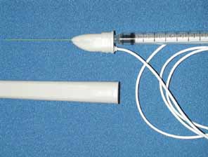 Fig. 1 Special 27-gauge, 1½-inch monopolar injection needle with Teflon coating. and positive electromyographic lead. The wire position can also be used to mark the position of the needle bevel.