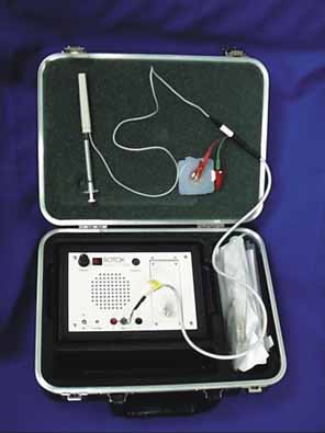 Fig. 2 Audio electromyographic device used for botulinum A toxin injections. A wire attaches to a special 27-gauge, Teflon-coated, monopolar injection needle attached to a tuberculin syringe. The device is grounded through a pediatric electrocardiographic electrode and fastened to the forehead.