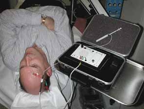 Fig. 3 Patient ready for botulinum A toxin extraocular muscle injection. Note the placement of the electrocardiographic electrode on the patient's forehead medially for a medial rectus muscle injection. The patient is in the supine position and the head is supported comfortably on a pillow. A tray, table, or other support is necessary for the audio electromyographic device since the electrode wires are only 24 inches long.