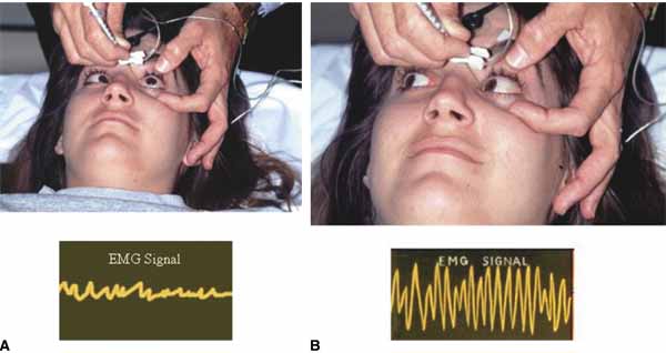 Fig. 4 Patient with a left sixth-nerve palsy undergoing left medial rectus muscle injection of botulinum A toxin. A. The eyelids are held open with the index finger and thumb and the patient is directed to look out of the field of action of the injected left medial rectus muscle. B. Once the electrode is inserted through the conjunctiva, the patient is asked to look into the field of action of the injected muscle to increase the electromyographic signal. The needle is advanced until the loudest signal is heard and then the fluid is injected. There is often attenuation of signal with injection.
