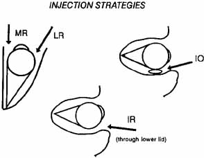 Until the ophthalmologist is familiar and experienced with the injection procedure, consideration should be given to treating only the horizontal rectus muscles. The vertical rectus muscles, because they have opposite functions from the nearby oblique muscles, require a higher level of expertise to avoid unwanted complications. Likewise, experience should be gained on adults before attempting injections in children.