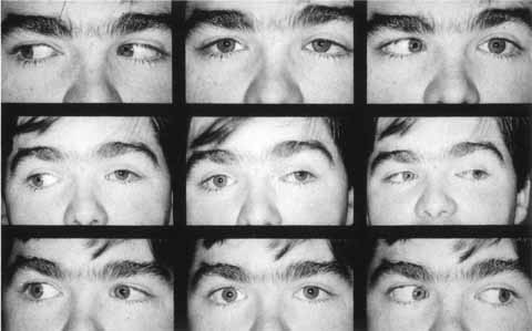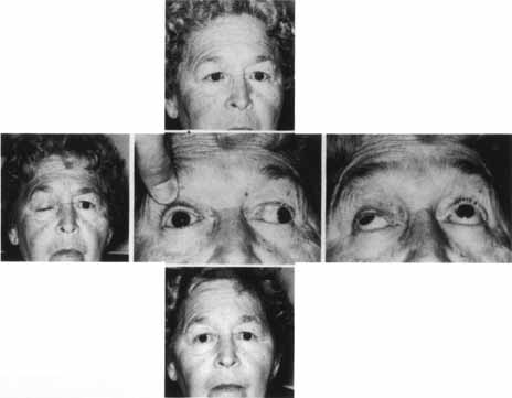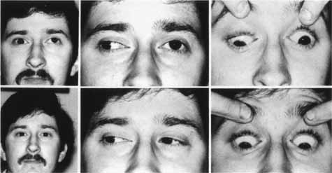 Fig. 9 Patient with a chronic left sixth nerve palsy. Top row. Preoperatively, note significant lack of abduction of the left eye. Middle row. One month postoperatively the patient has a significant paralysis of his left medial rectus muscle secondary to the botulinum A toxin injection. Note the amount of abduction. Bottom row. Six months postoperatively, the patient had 70-degree of single binocular vision and 3 degrees of abduction. (McManaway JW, Buckley EG, Brodsky MC: Vertical rectus muscle transposition with intraoperative botulinum injection for treatment of chronic sixth nerve palsy. Graefes Arch Clin Exp Ophthalmol 228:403, 1990)