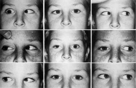 Fig. 7 A 7-year-old child with a right sixth-nerve palsy after head trauma. Top row. Eight weeks after head trauma and prior to botulinum A toxin injection. Note significant restriction to abduction of the right eye. Middle row. Four weeks after botulinum A toxin injection into the right medial rectus muscle. Note mild ptosis of the right upper lid and severe restriction of adduction of the right eye. Lateral rectus function has already improved significantly. Bottom row. Three months after botulinum A toxin injection, the patient's esotropia has resolved and medial and lateral rectus function are now normal.