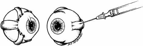 Once finished, the patient should be asked to sit up on the edge of the examination table but should not be allowed to stand until postinjection anxiety and bradycardia have subsided. Often the patient is so relieved that the process is over that an episode of lightheadedness or even syncope can occur. One to two minutes is usually all that is necessary at this time. It is not necessary to patch the eye or use antibiotics unless there is some concern about the injection process. The patient should be informed that topical anesthesia has been applied to the eye and ocular manipulation for the next 30 to 45 minutes should be discouraged. The patient should be observed for 5 to 10 minutes to make sure that no retrobulbar bleeding has occurred. Acetaminophen should suffice for any postinjection discomfort.