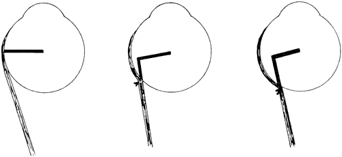 Alan Scott diagrammed the mechanics of Fd.12 He suggested that changing the arc of contact of the muscle with the globe reduces the lever arm formed by the muscle insertion, the center of rotation of the globe, and the origin of the muscle (Fig. 1). Scott's mechanical model suggested that the posterior suture needed to be 10 to 12 mm from the insertion for the medial rectus, 12 to 14 for the superior and lateral recti, and 14 to 16 for the lateral rectus.