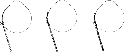 Fig. 2. A. Posterior fixation alone. Recession added with the slack created left in front of the suture (B) and with the suture brought forward in the muscle, so that the slack is posterior to the suture (C).
