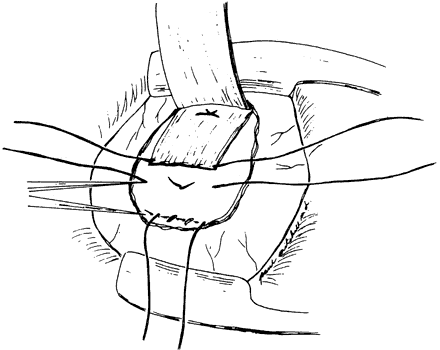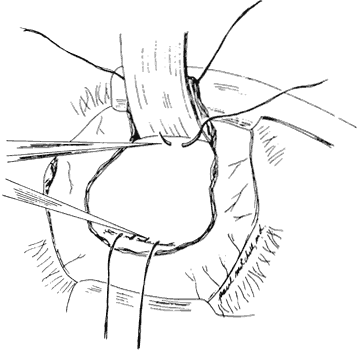 Heavy, nonabsorbable sutures should be used. Supramyd, a nonreactive suture type, does not drag tissue and is easy to tie. It is available in 5-0 diameter with short spatula needles. Mersilene and Dacron are more readily available, nonreactive, and can be procured in a 5-0 size with a short, flat spatula needle, such as the Alcon T-1 or D-5 models. It is helpful to have a short needle because the posterior surgical space is confined and the exposure is usually limited.