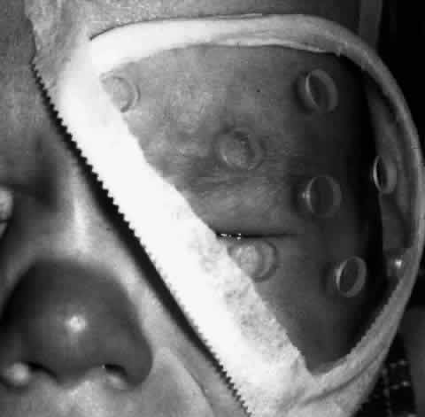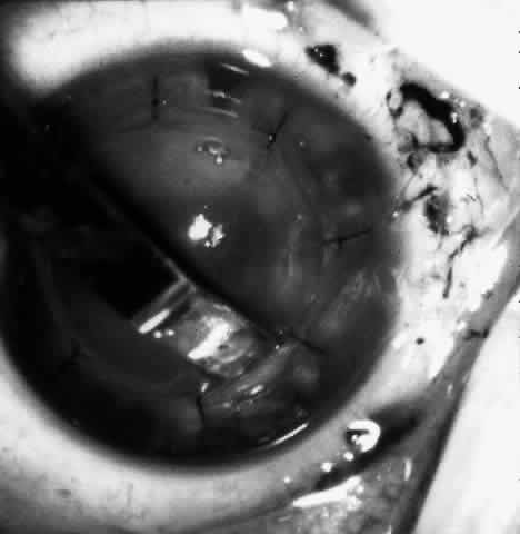 | Epikeratophakia has been used to correct aphakia in adults5 and children,6,7 as well as myopia,8 and to treat keratoconus.9 However, only epikeratophakia for pediatric aphakia is discussed here. The first pediatric patients to undergo epikeratophakia were children with unilateral congenital or traumatic cataracts who were either intolerant to contact lens wear or who were considered to be poor candidates for successful contact lens wear.10–14 Although the procedure was originally envisioned as a permanent optical correction for young children with unilateral congenital cataracts, it soon became apparent that epikeratophakia was not well suited as a first or sole solution to this problem because it could not achieve the very high power correction required for neonates and infants.15 Also, the rapid changes in refraction in the first year of life required a more flexible and easily changed optical prosthesis. For these reasons, epikeratophakia has been recommended for contact lens-intolerant, aphakic children who are 1 year of age or older. In these cases, the changes in dioptric power requirements that occur with the passage of time can be corrected with changes in spectacle overcorrection.15 Children who have traumatic cataracts with corneal lacerations are well served by this procedure because the injury often destroys the capsular support that can be used to stabilize an intraocular lens.16–18 The epikeratophakia graft provides structural support for the weakened cornea and minimizes the induced irregular and regular astigmatism, in addition to correcting the optical error (Figs. 3 AND 4).
