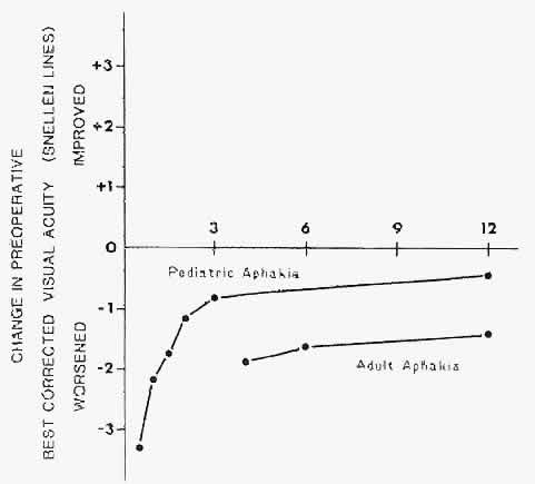 changes in the corneal curvature from the epikeratophakia procedure. The changes in corneal curvature over time were not significantly different from the normal changes in corneal curvature that occurred with the passage of time. In other words, if one achieved a corneal curvature of 65D in a 2-year-old child, the corneal curvature remained essentially the same 10 years later. There has been no evidence of any deterioration or loss of power with time in patients followed to date.26 (The longest follow-up in my experience has been 13 years.) In children younger than 2 years of age, slight changes in corneal curvature parallel the normal changes seen in the growing eye. Analysis of the accuracy of the procedure showed the achieved correction to be approximately 85% of the intended correction in children older than 1 year of age.25 In children younger than I year of age the achieved correction was only 50% of that intended. It appears that the younger corneas behaved differently perhaps because of their already steep curvature. This is further evidence that epikeratophakia is probably not the procedure of choice for neonates and young infants. For all of these reasons, it seems prudent to remove a cataract in a neonate or infant as soon as possible and to fit these very young patients with a contact lens. Contact lens compliance is usually quite good during the first year of life. Thereafter, when and if contact lens compliance becomes more difficult, epikeratophakia may be performed. The probability of achieving an accurate optical correction is much greater in older children and the correction, once obtained, is more likely to remain appropriate as the child grows. In the nationwide study of epikeratophakia in younger children,6 335 procedures were performed by a pool of nearly 100 surgeons. There was an 89% graft success rate in this series. Most of the problems were related to failure of the graft to epithelialize and these were treated by removal of the graft. Postoperatively, 73% of the patients were within 3D of emmetropia. There appears to be a learning curve in which the complications appear to decrease with increasing surgeon's expertise.20 Among the difficulties of dealing with younger children are the problems associated with obtaining accurate verbal responses for visual acuities both preoperatively and postoperatively and the complexities of assessing the impact that amblyopia had on visual acuity. For these reasons, older children in the nationwide study were analyzed separately.7 All 65 children in this group were between 8 and 18 years of age and were capable of verbal responses in the measurement of visual acuity. The graft success rate in the older children was 100%. None of these grafts was removed. The achieved accuracy in correction of dioptric powers was again 73% within 3D of emmetropia. Analysis of preoperative and postoperative visual acuity results showed that there was an average loss of one half of a Snellen line in the subgroups with traumatic cataracts and congenital cataracts. The rate of return of visual function in these children was plotted and compared with the rate in aphakic adults (Fig. 14). |