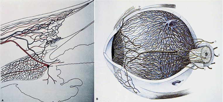 An understanding of the retinal vasculature and microcirculation is crucial for diagnosis and treatment of acquired retinal disease states, because the vast majority of nonheritable primary retinal diseases are vascular in origin. The retinal blood vessels exist to provide nourishment for the inner retinal layers and to carry off waste products from them. The outer retinal layers are normally avascular and are supplied through diffusion from the choriocapillaris. Despite this dual circulation to the retina, there appears to be functionally little overlap. This fact is best shown by the structural abnormalities induced by acute obstructions of the retinal circulation (CRA obstruction or branch retinal artery obstruction) These abrupt diminutions in inner retinal blood flow result in physiologic and anatomical dysfunction that is localized strictly to the inner retinal layers.