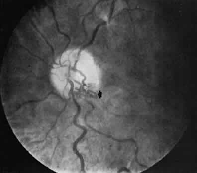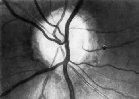 Fig. 2. The cilioretinal artery hooks around the temporal margin of the disc edge (*). (Henkind P, Benjamin JV: Trans Ophthalmol Soc UK 96:418, 1976)