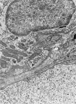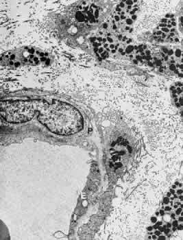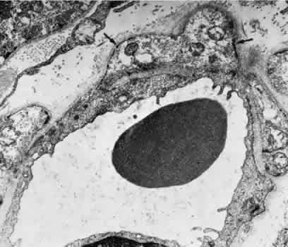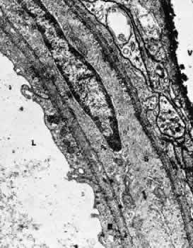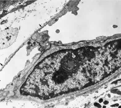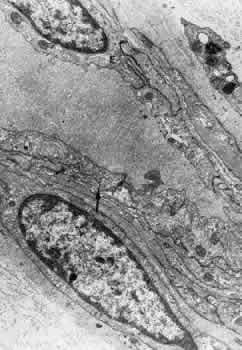 In the region of the endothelial cell junctions, cytoplasmic processes may overlap and form flap-like extensions that project into the lumen. The outer leaflets of adjacent endothelial membranes form very tight occluding junctions. The basement membrane surrounding the endothelial cell is well developed and continuous with the basement membrane surrounding the pericytes. The basement membrane of the retinal capillaries is structurally similar to that of the retinal arteries and veins in that collagen types 4 and 5, laminin, and heparin sulfate proteoglycan core protein are prominent features. Collagen types 1 and 2 appear to be lacking.12 Some areas show thinning of the basement membrane, and in these regions the endothelial cells and pericytes are closely apposed. Specifically, the capillary basement membrane between pericytes and endothelial cells is much thinner than the basement membrane covering the two types of cells.25 This arrangement probably allows increased communications between the cells. The retinal capillary basement membrane is thicker than in most other capillaries in the body, and in certain disease states such as diabetes, this thickness increases further.26