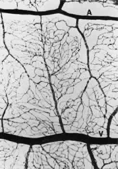 Fig. 6. Human retinal digest preparation. A broad capillary-free zone is present around the artery (A), and a much narrower one is seen about the vein (V) (PAS hematoxylin, × 12). (Wise GN, Dollery CT, Henkind P: Retinal Circulation. New York, Harper & Row, 1971)