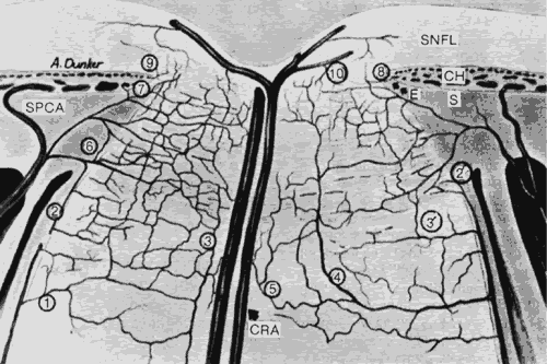 The laminar portion of the optic nerve head is also supplied by the short PCAs, with variable contributions from the circle of Zinn-Haller.37 The CRA does not appear to contribute much to the supply of this area (Figs. 9 and 10).