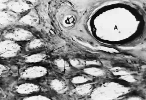 Fig. 10. Cross section of the lamina cribrosa showing fine blood vessels (arrows) traversing the trabeculae. The central retinal artery (A) is at the upper right.