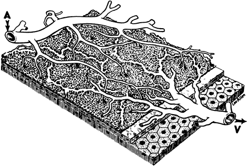 Fig. 11. Three-dimensional schematic representation of choriocapillaris low pattern. A, choroidal arteriole; V, choroidal vein. (Hayreh SS: Segmental nature of the choroidal vasculature. Br J Ophthalmol 59:631, 1975)