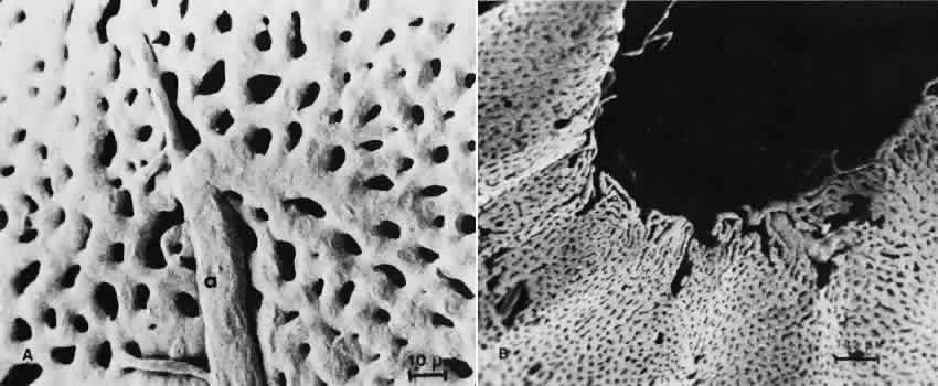 Fig. 13. Latex injection of choroidal vessels. A. The outer aspect (scleral view) of the choriocapillaris and an end artery. The transition from arteriole (a) to choriocapillaris may be subtle, but still one can discern an abrupt change in the course and caliber of vessel. B. The choriocapillaris shows an abrupt ending around the optic disc. This finding indicates that the choriocapillaris is not directly involved in the disc circulation. (Shimizu K, Ujiie K: In Delaey JJ, ed: Fluorescein angiography and angioarchitecture of the choroid. International Symposium on Fluorescein Anglography. Doc Ophthalmol 9:187, 1976)