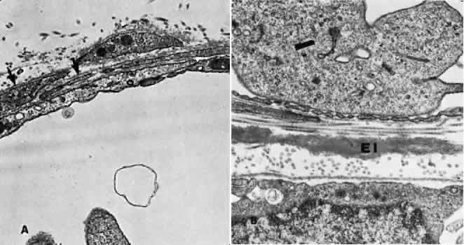 The intima of the retinal arteries contains a single layer of endothelial cells surrounded by a basement membrane. Collagen fibrils may be seen in the basement membrane. Elastic fibrils are not present, and there is no internal elastic membrane.