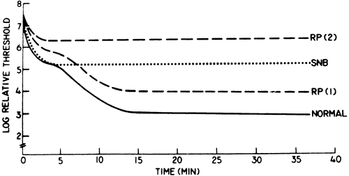 Fig. 2. Representative dark adaptation curves for a normal subject, a patient with congenital stationary night blindness (SNB), and two patients with moderately advanced retinitis pigmentosa, RP(1) and RP (2). (Berson EL: Night blindness: Some aspects of management. In Faye E, ed: Clinical Low Vision, p 302. Boston, Little, Brown & Company, 1976)