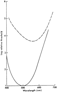 Fig. 3. Continuous line is CIE (Commission International de l'Eclairage) scotopic luminosity curve (rod spectral sensitivity function) derived from psychophysical measurements and placed at a level for normal human subjects; dashed line is Wald's photopic luminosity curve (spectral sensitivity function for the cone mechanisms under photopic conditions) derived from psychophysical measurements of peripheral retinal function. Electroretinographic spectral sensitivity curves for normal rod and cone systems also respectively approximate the solid line and dashed line curves. (Berson EL: Electrical phenomena in the retina. In Hart WM, ed: Adler's Physiology of the Eye. Clinical Application, 9th ed, p 641. St. Louis, CV Mosby, 1992)