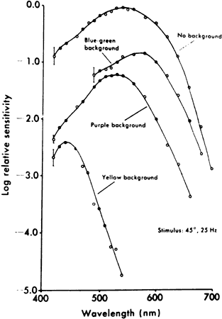 The peak sensitivity of the ERG to a 25-Hz white flickering light is near 555 nm under dark-adapted conditions (Fig. 4) because rods cannot respond to stimuli above 20 Hz under these test conditions.6 In the presence of different-colored steady background lights that desensitize one or another cone system by bleaching that system (i.e., dissociating opsin from vitamin A), one can isolate blue, green, and red cone function to this 25-Hz white flicker-ing light. In the presence of a bright yellow back-ground light that desensitizes green and red conefunction, presentation of this flickering light results in a peak sensitivity near 440 nm, thereby isolating blue cone function. In the presence of a purple adapting light that desensitizes the blue cone and red cone systems, the peak sensitivity of the eye is near 540 nm, thereby isolating green cone function. In the presence of a blue-green steady background light that desensitizes the blue cone and green cone systems, the peak sensitivity is near 580 nm, thereby isolating red cone function. In each case the chromatic background minimizes or eliminates the contribution of two cone mechanisms, thereby permitting isolation of the third cone mechanism. These three spectral sensitivities, derived from ERG testing in the presence of chromatic backgrounds, correspond with the absorption characteristics of individual blue, green, and red cones, determined with microspectrophotometry, thereby helping to establish that these three functions are generated by the blue (short wavelength sensitive), green (middle wavelength sensitive), and red (long wavelength sensitive) cones, respectively.7,8