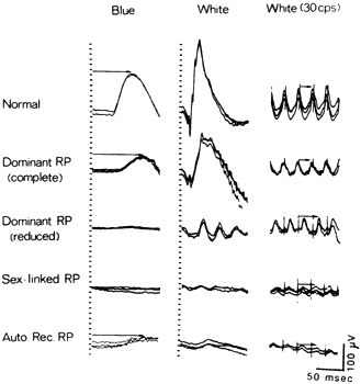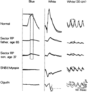 In Figure 6 ERGs are also illustrated from a patient with stationary night blindness with myopia with a defect in intraretinal rod transmission and from a patient with Oguchi's disease with a defect in rod neural adaptation to show that forms ofstationary night blindness also have normal coneb-wave implicit times. These ERGs in patients with stationary night blindness are contrasted with the delays in b-wave implicit time seen in patients with progressive forms of night blindness associated with RP (see Fig. 5). Therefore, the full-field ERG can be used as an aid in defining the type and extent of rod and cone involvement and the long-term prognosis in some patients with hereditary retinal diseases.16