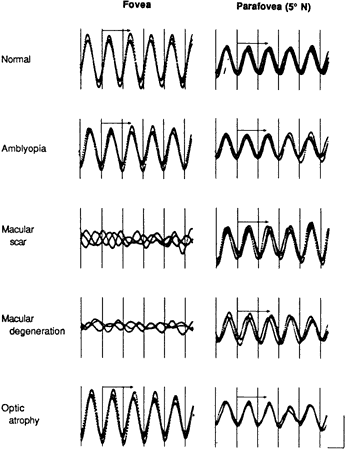 We can now visualize stimuli on the fundus and record from focal areas within the macula.21,22 These focal ERGs are elicited with a stimulator ophthalmoscope. With this instrument, a 4-degree, 42-Hz white flickering stimulus is presented within a 10-degree white steady surround; this flickering stimulus allows isolation of cone function, and the steady surround permits visualization of the fundus. The surround also desensitizes the retina just outside the stimulus, thereby minimizing any possible responses that could be generated by the effect of stray light from the stimulus. A patient with decreased vision and a one-disc diameter or larger central macular scar would be expected to have foveal cone ERG responses indistinguishable from noise when the stimulus is centered within the scar, but normal responses when the stimulus is centered outside of the scar in a parafoveal area that appears normal on ophthalmoscopic examination. A patient with decreased vision due to strabismic amblyopia or optic atrophy would be expected to have a normal foveal ERG (Fig. 8).23