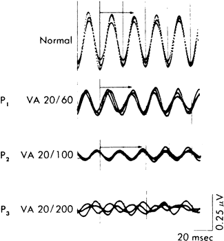 Foveal cone ERGs elicited with a stimulator ophthalmoscope are illustrated in Figure 9 for a normal subject and for three patients with juvenile hereditary macular degeneration with visual acuities ranging from 20/60 to 20/200. These patients had normal full-field cone flicker responses (i.e., >50 μV), but foveal cone ERGs were reduced in amplitude (i.e., < 0.18 μV in this test system) without (patient 1) or with (patient 2) delays (i.e., >38 ms) in implicit times, or indistinguishable from noise (patient 3).22 These foveal ERGs are quantitated with computer averaging and narrow bandpass filtering, thereby permitting detection of these small responses. Focal cone ERGs have proved useful in detecting and quantitating macular cone malfunction in patients with early stages of juvenile recessively inherited macular degeneration with visual acuity reduced to 20/50 or below. Patients with visual acuity less than 20/100 have had smaller and slower foveal cone ERGs than those with better visual acuity.24