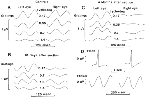 Fig. 10. Examples of pattern-reversal electroretinograms recorded from one cat before and after the section of the right optic nerve. A. Control records obtained from the two eyes before the section of the optic nerve. B and C. Records obtained 18 days and 4 months after the optic nerve section. Each record is the average of 500 responses. Stimulus: vertical sinusoidal grating reversed in contrast 16 times per second; contrast, 30%; mean luminance, 10 cd/m2. The spatial frequency is indicated next to each record. D. Electroretinogram in response to 50-msec light flashes (250 trolands) and to light flickering at 8 Hz (mean luminance, 10 cd/m2; amplitude of square-wave modulation, 40%) recorded from the two eyes 4 months after section of the right optic nerve. (Maffei L, Fiorentini A: Electroretinographic responses to alternating gratings before and after section of the optic nerve. Science 211:953, 1981)