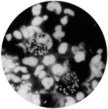 Calcofluor White Calcofluor white is a colorless dye used as a fabric brightener because it binds to carbohydrate polymers and reflects short-wavelength visible light. This fluorochrome combines with polysaccharides such as chitin that are present in fungal cell walls and in the exocyst of Acanthamoeba. Evans blue is used as a counterstain to stain cells and tissue debris dark red. Under ultraviolet light, calcofluor white stains yeasts, psuedohyphae, hyphae, and amoebic cysts bright apple-green against a dark background.56–58 Smears can be subsequently Gram's or silver-stained. Rhodamine-Auramine Fluorochrome dyes such as rhodamine and auramine bind directly to mycolic acid in the mycobacterial cell wall and can be detected by fluorescent microscopy. With potassium permanganate as a counterstain, mycobacteria, Nocardia, and microsporidial spores stain yellow against a dark green background when viewed with a fluorescein isothiocyanate light filter. Mycobacteria are usually easier to detect with a fluorochrome stain than with acid-fast staining, but not all atypical mycobacteria stain equally well with rhodamine-auramine. A carbolfuchsin acid-fast stain can be done on the same slide. Fluorescein-Conjugated Stains Fluorescein isothiocyanate (FITC) can be bound to proteins known to target particular microbial components, such as antibodies and lectins. Fluorescein-conjugated monoclonal antibodies are available to detect several microorganisms and viruses. Lectins are glycoproteins, such as wheat-germ agglutinin and concanavalin A, that bind to microbial cell-wall polysaccharides.59 Optimal use of fluoresceinated lectins is limited by the changing carbohydrate composition of microbial cell walls during different growth phases and under different environmental conditions. Fluorescent microscopy requires appropriate exciter and barrier filters. Immersion oils, if used, should be low-fluorescing. A high-quality laboratory microscope can be retrofitted with epi-illumination using halogen lamps and interference filters to perform fluorescent microscopy. ELECTRON MICROSCOPY The limit of light microscopy is approximately 200 nm. Except for vaccinia and other poxviruses, with diameters of approximately 250 nm, individual viruses cannot be seen with direct microscopic observation using visible light. Transmission electron microscopy is not generally used for rapid diagnosis except for organisms that cannot be identified by other means. The specimen may be fixed, but better resolution occurs if the fresh specimen is processed immediately. Specific antibody is added for immunoelectron microscopy. Electron-dense substances such as phosphotungstic acid and uranyl acetate negatively stain viruses against a darkly contrasting background. Presumptive viral identification is based upon the presence or absence of an envelope and the shape and arrangement of the nucleocapsid.60,61 Transmission electron microscopy is also helpful in the taxonomy of other microorganisms. For example, the spirals of the polar filament of microsporidia aid in classification. |
