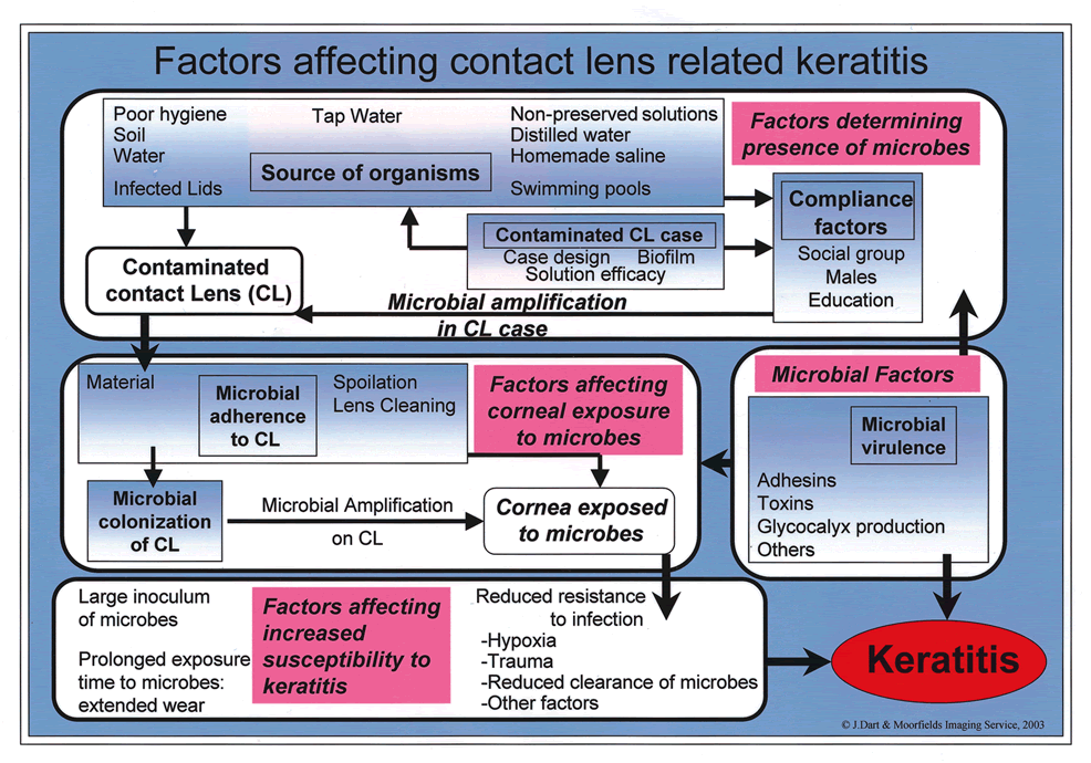 keratitis are widespread in the CL user's environment. Pseudomonas and Acanthamoeba are present in contaminated water supplies and solutions. CL users may