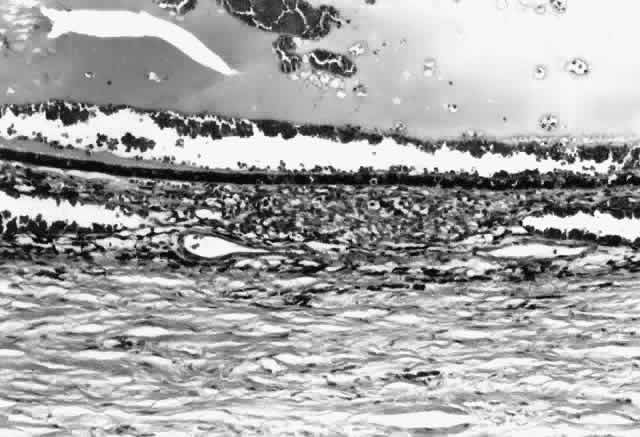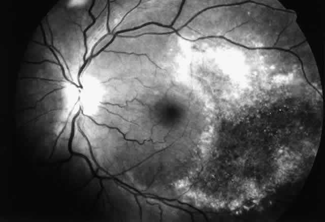 In non-AIDS patients, the spread of disease along vessels has been attributed to infection of vascular endothelial cells, which break free and travel through the retinal circulation.22 In support of this hypothesis, inclusion bodies have been identified in retinal endothelial cells of organ transplant patients with CMV retinopathy. Endothelial cell inclusions have been reported rarely in choroidal tissue of AIDS patients,18,20 but no CMV antigen has been identified in retinal endothelial cells by immunochemical techniques, even in vessels that travel through areas of retinopathy.17 Thus, endothelial cell infection does not appear to play a significant role in the spread of CMV retinopathy in AIDS. CMV retinopathy is more common among patients with AIDS than among other severely immunosuppressed individuals. The frequent development of CMV retinopathy may be related in part to the retinal microvasculopathy that is common to HIV-infected patients.9,23 Ultrastructural studies of retinal capillaries have demonstrated basal lamina thickening, swelling of endothelial cells, narrowing and occlusion of vascular lumina, and loss of pericytes. This microvascular disease may allow access of virus to retinal tissue through damaged vessel walls. Hematogenous spread of virus to the eye is supported by the finding of CMV-like viral particles within macrophages in the choroidal circulation of an AIDS patient with CMV viremia.19 Sludging of blood flow through the retinal circulation may also contribute to infection by increasing the contact time between circulating infected cells and the retina.24 The only systemic risk factor that has been clearly associated with the development of CMV retinopathy in HIV-infected patients is a low CD4 lymphocyte count.12,25,26 The infection almost always occurs in patients with counts less than 50 per cubic millimeter. Human cytomegalovirus is highly species-specific, making the study of human CMV infections in animal models difficult. Attention has therefore been focused on murine CMV infections in mice as a possible model for the study of human CMV retinopathy. Holland and associates showed that murine CMV was capable of causing retinal necrosis in immunosuppressed mice.27 Other investigators have subsequently studied the role of immune defenses against murine CMV retinopathy.28,29 There are many differences between murine and human CMV infections of the eye, however, and extrapolations about disease mechanisms to human CMV retinopathy should be made with caution. For example, murine CMV seems to have a propensity for uveal tissue, unlike its human counterpart. Also, susceptibility of murine and human CMV isolates to various antiviral agents is very different, making these models of little use for the investigation of new antiviral agents. Recently, a rabbit model of disease using human CMV was reported.30 Chorioretinal inflammation and destruction are seen, but additional study will be required to determine the extent to which the lesions and the course of disease mimic human retinal infection. The treatment of CMV retinopathy with new antiviral drugs has been reviewed elsewhere.31 Despite its apparent predilection for retinal tissue, CMV is found occasionally on the ocular surface. Cytomegalovirus has been isolated from conjunctival swabs of patients undergoing bone marrow transplantation at UCLA. Also, 19.5% of childhood leukemia victims in one series had CMV in tears.32 The site of infection was not determined in these studies. CMV was found by culture in ocular adnexal tissue of a patient with AIDS and conjunctivitis, but autopsy examination revealed no virus in the lacrimal gland.33 Cytomegalovirus has also been found by electron microscopy in the conjunctiva of an HIV-infected patient without clinical signs of disease related to CMV.34 VARICELLA ZOSTER VIRUS Zoster ophthalmicus, with cutaneous lesions in the dermatome of the first division of the trigeminal nerve, keratitis, and anterior uveitis, can be seen relatively early in the course of a patient's HIV disease and is believed to be a harbinger of further deterioration in the patient's immune status.35,36 The severity of lesions and inflammation varies widely between patients. Patients with HIV disease can also develop a chronic, productive varicella zoster virus infection of the corneal epithelium that resembles herpes simplex virus epithelial keratitis.37 This infection has never been reported in immunocompetent patients. It occasionally follows zoster ophthalmicus, with isolation of varicella zoster virus from corneal lesions many weeks after the resolution of cutaneous vesicles. In other patients there is no history of cutaneous zoster. Varicella zoster virus can also cause a severe necrotizing retinopathy in HIV-infected patients (Fig. 4).38–41 It may present as an isolated infection or may occur concurrently with or after cutaneous zoster in any dermatomal distribution. In most HIV-infected patients, varicella zoster virus retinopathy presents as a distinctive clinical disorder known as “the progressive outer retinal necrosis syndrome.”41 It is characterized by multifocal, deep opaque retinal lesions (believed to be retinal edema) that quickly coalesce to involve the entire retina. The retina can become completely necrotic over a period of a few days to a couple of weeks. There is little or no vitreous or anterior chamber inflammatory reaction. Occlusive vasculitis is not a primary feature of the disease, although patients are ultimately left with severe vascular attenuation. The optic nerve may be hyperemic, and optic atrophy is a sequela of the infection. Histopathologic examination of two cases showed viral antigens and viral particles in the outer retinal layers, consistent with the appearance of deep retinal lesions.39 There were variable amounts of inflammation in the retinas, and scattered areas of choroidal inflammation, although there was no evidence of choroidal infection by the virus.