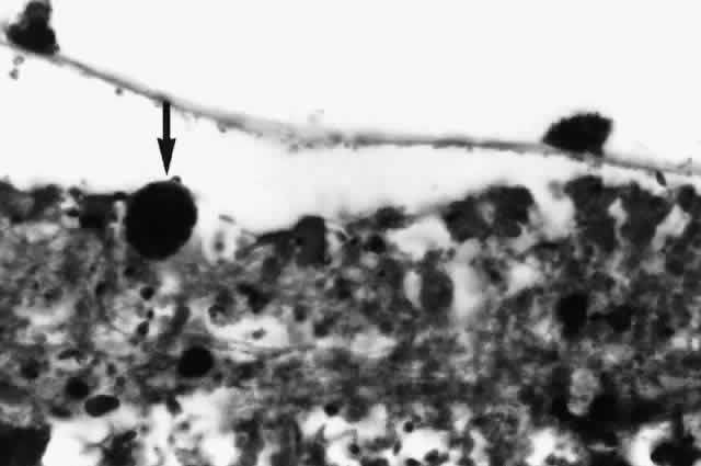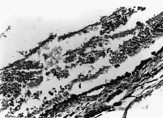 Cytomegalovirus (CMV) retinopathy is by far the most common of the severe ophthalmic infections in patients with AIDS. Varicella zoster virus retinopathy is being seen with increasing frequency; although it is probably the second most common retinal infection in North American HIV-infected patients, it is still far less common than CMV retinopathy. Toxoplasmic retinochoroiditis is the third retinal infection that is seen with some regularity, especially in certain areas of Europe and South America. The remaining retinal infections associated with AIDS are uncommon. They are seen with disseminated infections, in which the massive proliferation of organisms may overwhelm the patient's limited immune defenses. They are usually seen late in the course of the syndrome; thus, they may actually signal further waning of immune defenses. Patients with intraocular infections should be suspected of having tissue-invasive infections involving other internal organs. When they do occur, intraocular infections are frequently extensive and severe. Infections of the cornea and external eye are less common in HIV-infected individuals than intraocular infections. The natural defenses of normal eyelid function, tear film, and an intact corneal epithelium protect against many exogenous pathogens. It is therefore important that factors that might compromise those defenses, such as epithelial defects or trichiasis, be corrected as soon as possible. Also, HIV-infected patients who wear contact lenses should adhere strictly to lens care and disinfection techniques. Many HIV-infected individuals appear to have decreased aqueous tear production, which leads to feelings of dryness and irritation but does not seem to result in an increased incidence of ocular surface infections. At greater risk are patients who have permanent damage to the eyelids from zoster ophthalmicus, neurotrophic corneas from herpetic infections, or damage to the ocular surface from cicatricial conjunctivitis, similar to that of Stevens-Johnson syndrome, which is seen occasionally in patients with AIDS. HIV infection and its sequelae are being studied in a variety of animal models. Rhesus monkeys infected with simian immunodeficiency virus develop an AIDS-like illness. In this model the monkeys develop a variety of ophthalmic lesions, including CMV infections of the retina.10 This model may be useful for future studies of AIDS-related ophthalmic infections. CYTOMEGALOVIRUS Cytomegalovirus retinopathy is the most thoroughly studied of the ophthalmic manifestations of HIV infection. CMV retinopathy is an AIDS-defining index disease. Most studies have concentrated on treatment, but a great deal has been learned about the natural history of CMV retinopathy during the course of these studies. Cytomegalovirus is a ubiquitous DNA virus of the herpes group. Most of the adult population has been infected with CMV, but in most cases it does not cause any clinically apparent disease. The virus remains in the body, however, as a latent infection. In patients with AIDS, CMV can cause life-threatening infections involving many tissues, including the brain, lungs, and gastrointestinal tract. The reported prevalence of CMV retinopathy varies from 4% of ambulatory patients (primarily intravenous drug abusers)11 to 34% of eyes in an autopsy series of male homosexuals.9 This discrepancy may reflect the fact that CMV retinopathy occurs late in the course of AIDS. Most investigators believe that the true prevalence of CMV retinopathy among patients with AIDS is approximately 15% to 25%. It has been suggested that CMV retinopathy is more common in homosexuals, because of different levels of exposure to CMV between risk groups.11,12 Cytomegalovirus retinopathy is clearly a disorder of immunosuppressed persons. Prior to its association with AIDS, the infection in adults was seen almost exclusively in patients with defects in cellular immunity related to disease or immunosuppressive drugs.13,14 A single report of CMV retinopathy in a healthy adult was not confirmed by culture or tissue examination.15 There is no obvious correlation between the development of CMV retinopathy and levels of CMV antibodies. CMV retinopathy has been reported in the absence of detectable antibodies.16 Histologic studies of AIDS-related CMV retinopathy demonstrate the tissue necrosis and cytomegalic cells characteristic of all CMV infections (Fig. 1).9,17 Electron-microscopic and immunochemical studies have identified CMV viral particles and antigen in a patchy distribution throughout all layers of the retina and occasionally in contiguous retinal pigment epithelial cells.9 Viral antigens are only rarely identified in the choroid.9,18 Viral antigen in the choroid has been found in association with vessels and is not always adjacent to areas of retinopathy, suggesting that the virus reaches the choroid through independent hematogenous spread rather than by extension of infection from the retina. Among cases of AIDS examined at autopsy, 22% to 50% of those with CMV retinopathy have neutrophilic infiltrates in retinal tissue.9,19 This finding is atypical when compared with CMV retinopathy in non-AIDS patients, in which only a sparse lymphocytic infiltrate is observed. The difference has been attributed to intact granulocyte function and chemotaxis in patients with AIDS, in contrast to infants, organ transplant recipients, and patients with malignancies who can have more severe quantitative or qualitative granulocyte dysfunction.9 It has been noted that patients on immunosuppressive drugs can develop marked inflammatory reactions to CMV retinopathy when such drugs are withdrawn.14 Acute inflammatory cells may extend into the adjacent choroid despite the absence of identifiable viral antigens.9 The vitreous usually remains remarkably free of inflammatory material, despite the presence of virus in the vitreous cavity.20 A variety of stimuli (CMV antigen, immune complex deposition, and tissue necro