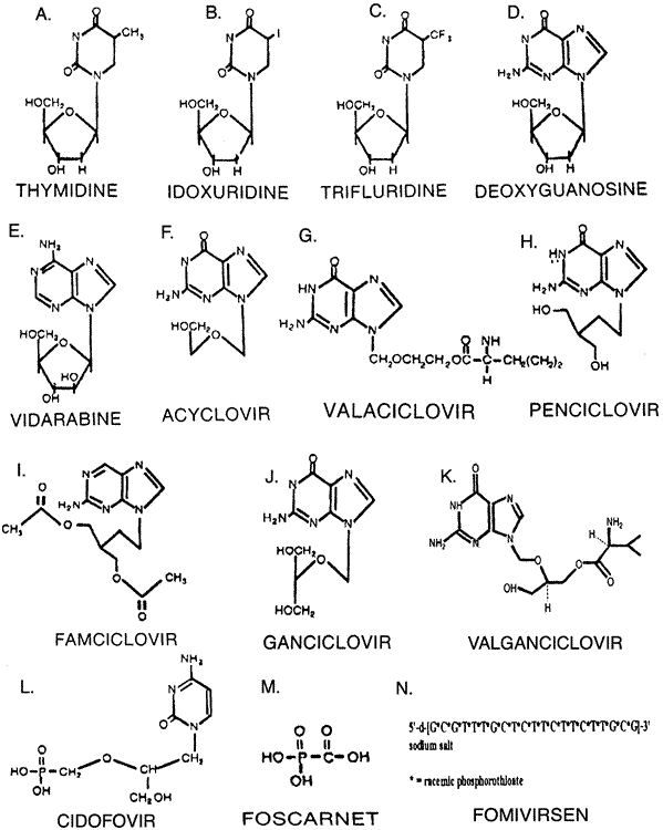 Although it is difficult to target viral components without hitting a few cellular components on the way, important advances have been made in antiviral chemotherapy. Nine systemic or intracameral antiviral drugs (vidarabine, acyclovir, famciclovir, valaciclovir, ganciclovir, valganciclovir, cidofovir, foscarnet, and fomivirsen) and four topical agents (idoxuridine, vidarabine, trifluridine, and acyclovir) are in widespread use in ophthalmic viral infections. Topical and oral BVDU and interferon show clinical potential but remain largely experimental.1–8 The organisms targeted most effectively by these drugs are herpes simplex virus (HSV), herpes varicella-zoster virus (VZV), cytomegalovirus (CMV), vaccinia, and to some extent, adenovirus and Epstein-Barr virus (EBV).