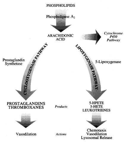 Fig. 1. The arachidonic acid pathway.52–55,57,58,61 Corticosteroids exert their effect on the arachidonic acid pathway by inhibiting phospholipase A2. This action decreases the production of both the cyclo-oxygenase pathway and the lipoxygenase pathway products. Nonsteroidal anti-inflammatory drugs (NSAIDs) presently available usually inhibit the action of either prostaglandin synthetase or 5-lipoxygenase, or both of these enzymes. When both enzymes are inhibited by NSAIDs, the inhibition is usually unequal. Thus, NSAIDs may allow production of some of the arachidonic acid pathway products. This differential effect of NSAIDs on the cyclo-oxygenase and lipoxygenase pathways can shift the balance of the resulting arachidonic acid pathway products. For example, a cyclo-oxygenase inhibitor drug can shunt arachidonic acid away from the cyclo-oxygenase pathway and down the lipoxygenase pathway, resulting in larger amounts of lipoxygenase pathway products than would be seen in the absence of the drug.59,60 The cytochrome P450 pathway represents only a minor portion of the arachidonic acid metabolism.