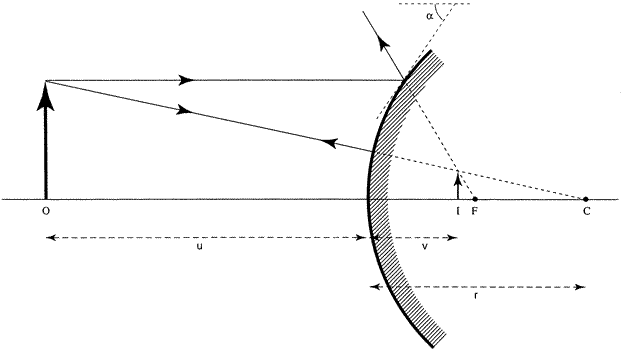 Fig. 1. Image formation by a convex mirror. Keratometry and keratoscopy utilize the property of the anterior corneal surface to reflect light, forming a virtual erect image within the anterior chamber. O, object; I, image; F, focal point; C. center of curvature of cornea; u, distance of object from cornea; v, distance of image from cornea; r, radius of curvature of cornea. (Corbett MC, Rosen ES, O'Brart DPS: Corneal Topography: Principles and Applications. London, BMJ Books, 1999.)