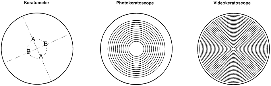 Fig. 2. Mires. Representation of the corneal area covered by the mires of the keratometer (two perpendicular pairs of mires, A and B, situated on an anulus approximately 3 mm in diameter), photokeratoscope (12 rings), and computer-assisted videokeratoscope (25 rings). (Corbett MC et al: Corneal Topography Principles and Applications. London, BMJ Books, 1999.)