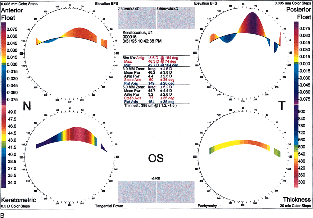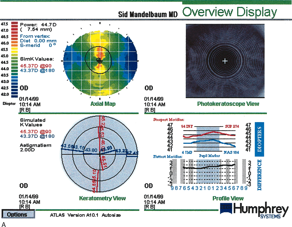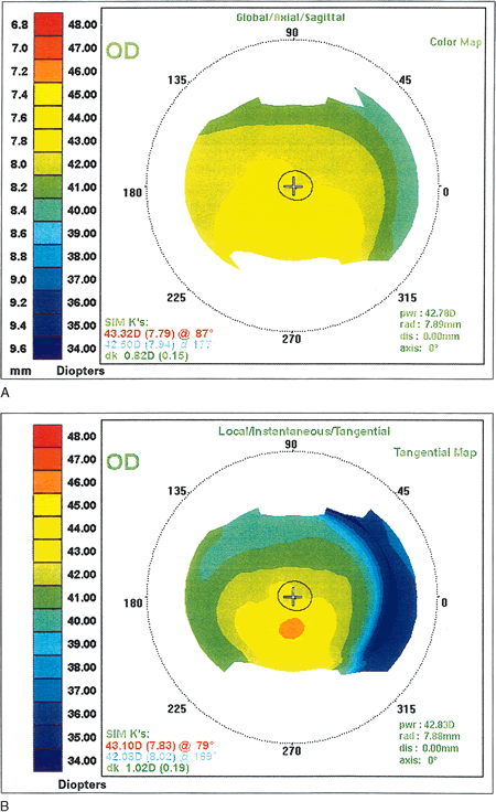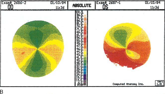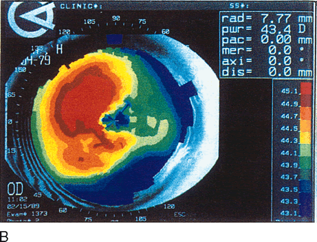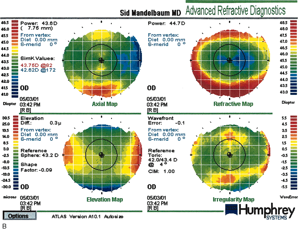 Fig. 17. Pre–photorefractive keratectomy (PRK) anterior elevation map (A) topography compared with a post-PRK map (B). The circular central excimer laser treatment is demonstrated. There is some residual with-the-rule astigmatism 28 months post-treatment. (Courtesy of Sid Mandelbaum, MD.)