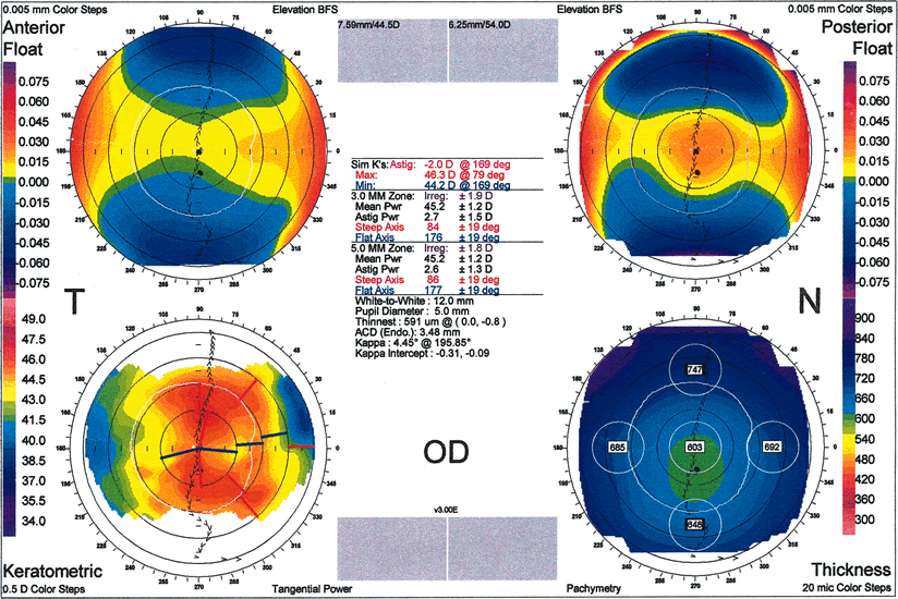 The anterior corneal surface has a power of 49.50 D and the posterior corneal surface has a power of –6.00 D, rendering a total corneal power of 43.50 D. Mean keratometric astigmatism is 0.90 D. Central corneal thickness is 560 nm and peripheral corneal thickness is 1200 nm. Pachymetry patterns were classified by Liu and colleaguesl into four categories: round (41%), oval (48%), decentered round (2%), and decentered oval (9%).12