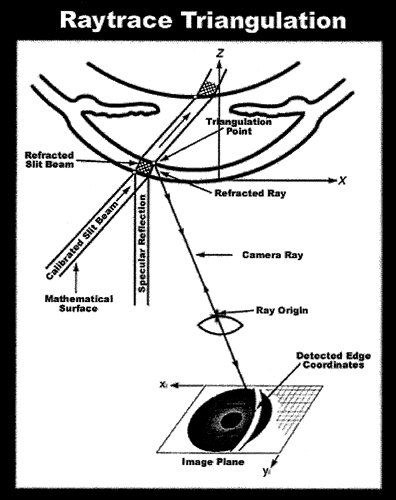 Fig. 5. The principle behind the slit topography projection-based method involves ray-trace triangulation. (Orbscan, ORBTEK, Inc., Utah.)