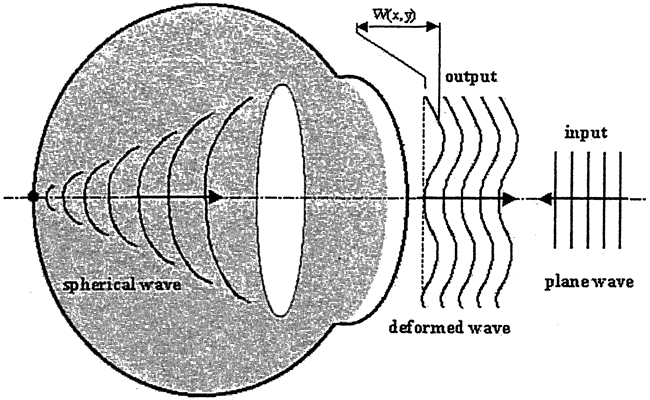 Fig. 6. Wavefront technology evaluates the entire optical system. The eye is illuminated by a plane wave. In an ideal eye, the wave traveling inside this organ is a spherical wave that provides a bright point on the fovea. In reality, the wavefront is not spherical. If the fovea acts as a point source, it provides a divergent spherical wave that exits the eye as a plane wave, which in reality is a deformed wave. (Haman H: A Quick Method for Analyzing Hartmann-Shack Patterns: Application to Refractive Surgery. J Refract Surg 16:S636-S642, 2000.).