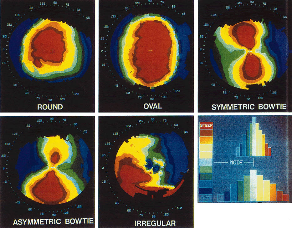 The normal population consists of a variety of corneal curvatures that are compatible with good vision and within the normal spectrum. Five videokeratoscopic patterns lie on the normal spectrum of corneal curvature: round (23%), oval (21%), symmetric bow tie (18%), asymmetric bow tie (in which the ends of the bow tie are of significantly different sizes) (32%), and irregular(in which the ends are at an angle to one another) (7%) (Fig. 7).10 In addition, there is diurnal variation due to stromal edema during sleep, menstrual variation, and lifetime variation. Infants usually have spherical corneas. During childhood and adolescence, regular with-the-rule astigmatism develops in about 90% of individuals. This reverses with subsequent aging processes. Diurnal and menstrual variations are generally subclinical.11