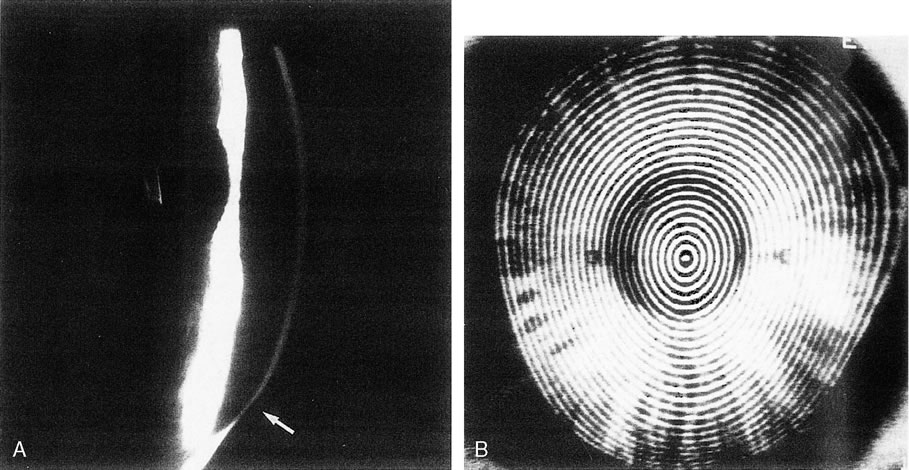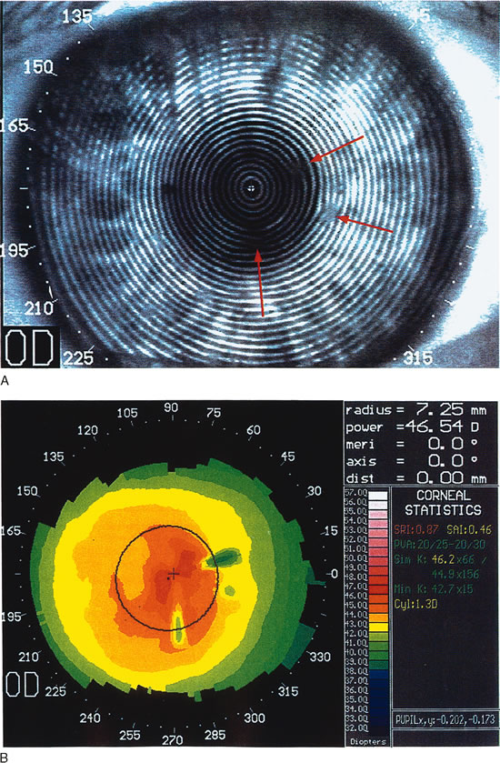 Fig. 8. Recurrent corneal erosion. In this patient with recurrent corneal erosion, no epithelial abnormality could be detected on biomicroscopic examination between attacks. A. The videokeratograph showed irregularity of the mires (arrows) in the 10-degree, 270-degree, and 350-degree semimeridians, about 1 to 2 mm from the corneal center. B. These correspond to areas of focal flattening on the topography. (Corbett MC, Rosen ES, O'Brart DPS: Corneal Topography Principles and Applications. London, BMJ Books, 1999.)