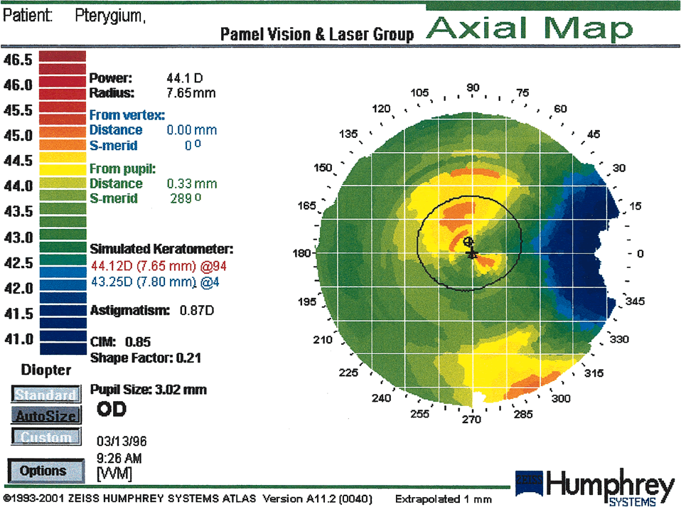 Fig. 9. Moderate pterygium. The pterygium has encroached about 3.5 mm onto the nasal cornea. Flattening is restricted to the peripheral and paracentral cornea, leaving only mild, regular astigmatism within the pupillary aperture. (Courtesy of Gregory Pamel, MD.)