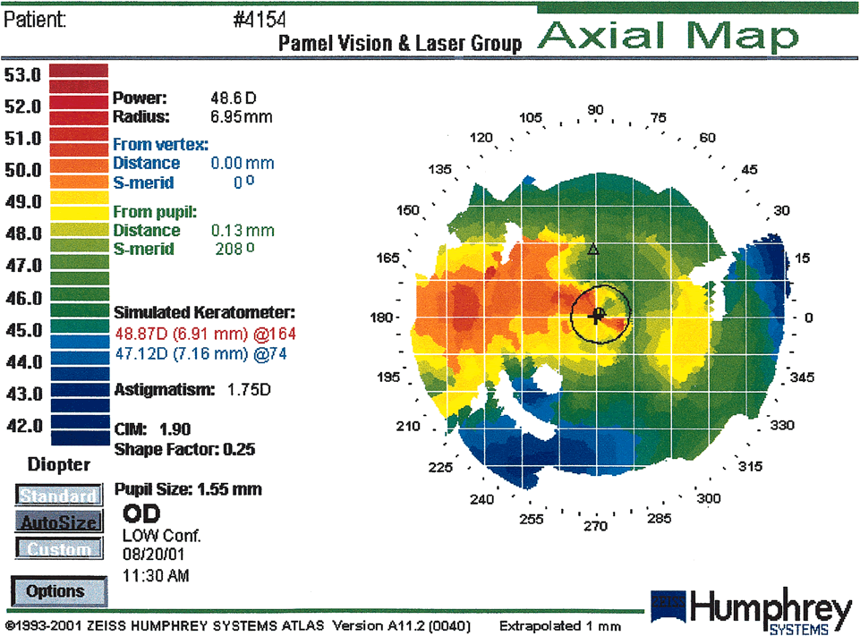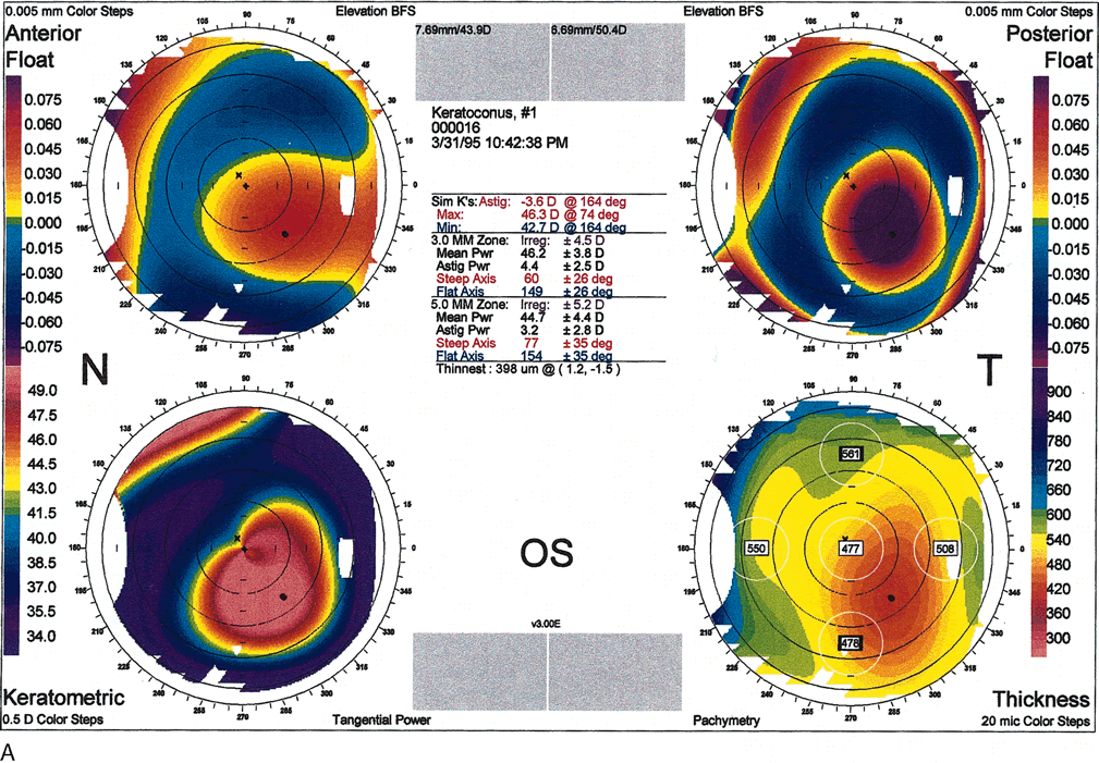 Several authors have recommended topographical indices for detecting early keratoconus and suspected keratoconus. The diagnosis, however, still requires the presence of Vogt's striae, a Fleischer ring, or corneal thinning. The surface asymmetry index (SAI) measures the irregularity of the cornea in the central 4.5-mm zone. It measures the difference in corneal power between points on the same ring 180 degrees apart. The inferior-superior (I-S) value measures the average power at five superior points 3 mm from the center at 30-degree intervals and compares this to five inferior points 3 mm from the center at 30-degree intervals. K is the central K-reading; when used alone, a value greater than 47.2 is suggestive of keratoconus. The KCI%, KPI% and KISA% are values derived by a combination of other indices. For example, the keratoconus predictability index (KPI) combines the SAI with seven other indices in an algorithm to predict the presence of keratoconus with 68% sensitivity and 99% specificity. Auffarth and co-workers. used the Orbscan to evaluate a series of keratoconus patients and noticed that the apex and thinnest point were located separately but with no consistent distance or pattern.20 The thinnest point was less than 0.500 mm. Furthermore, there is a high degree of nonsuperimposable mirror-image symmetry in the location of the cones between the right and left eyes of the same patient. The nonsuperimposability is due to the variation in radii between the apex and the thinnest point.20–23