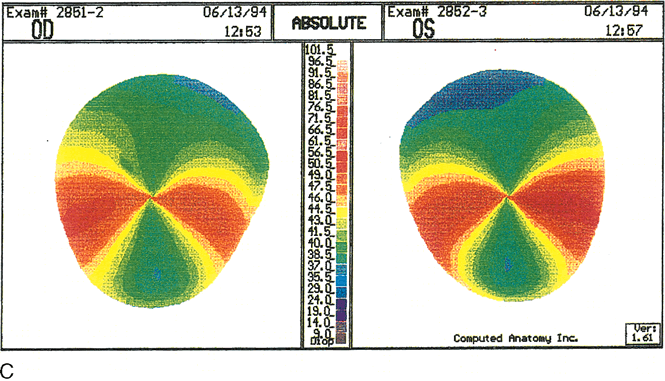 Fig. 12. Keratoglobus. A. Videokeratoscopic image of a patient with keratoglobus in the left eye showing inferonasal narrowing of the rings, indicating steepening, but without the pear-shaped configuration seen in pellucid marginal degeneration. B. Videokeratography of the right eye shows marked against-the-rule astigmatism of 6.3 diopters (D). C. The left eye shows irregular astigmatism with quite irregular power distribution. The axis of lowest corneal power is shifted about 35 degrees from the vertical axis, with a very asymmetric bow-tie configuration and with the inferior low-power semimeridian positioned above an area of high power at the inferior peripheral cornea. This area of peripheral inferior corneal steepening extends to the steep oblique semimeridians. (Karabatsas CH, Cook SD: Topographic analysis in pellucid marginal degeneration and keratoglobus. Eye 10:451–455, 1996.)