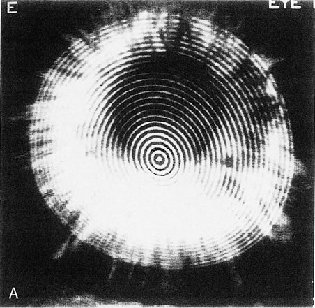 Fig. 14. Irregular astigmatism in post-penetrating keratoplasty produced by a tight suture at 165 degrees. (Courtesy of Gregory Pamel, MD.)